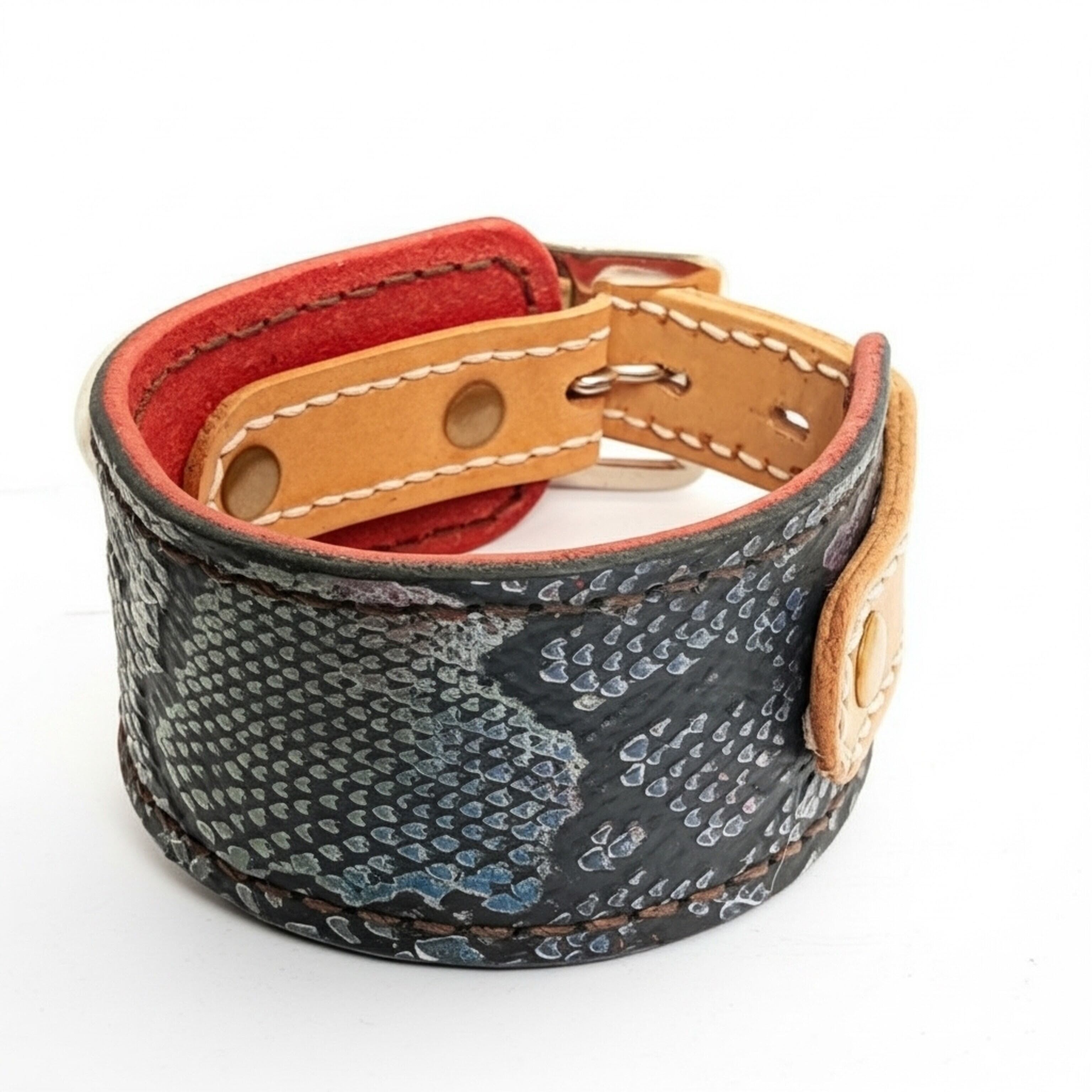 外側には個性的な型押しレザー、内側には肌当たりの良いナチュラルレザーを使用。