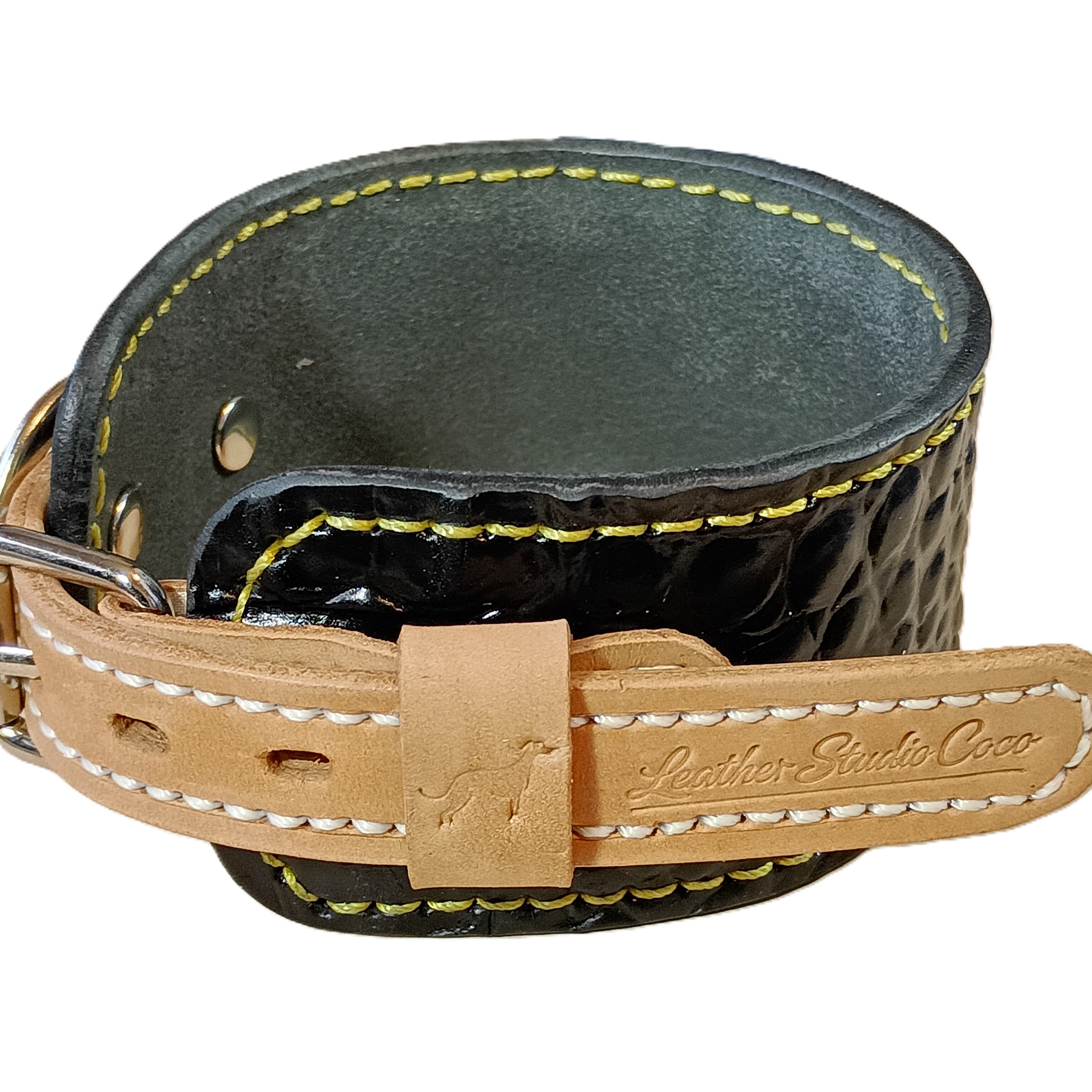 外側には個性的な型押しレザー、内側には肌当たりの良いナチュラルレザーを使用。