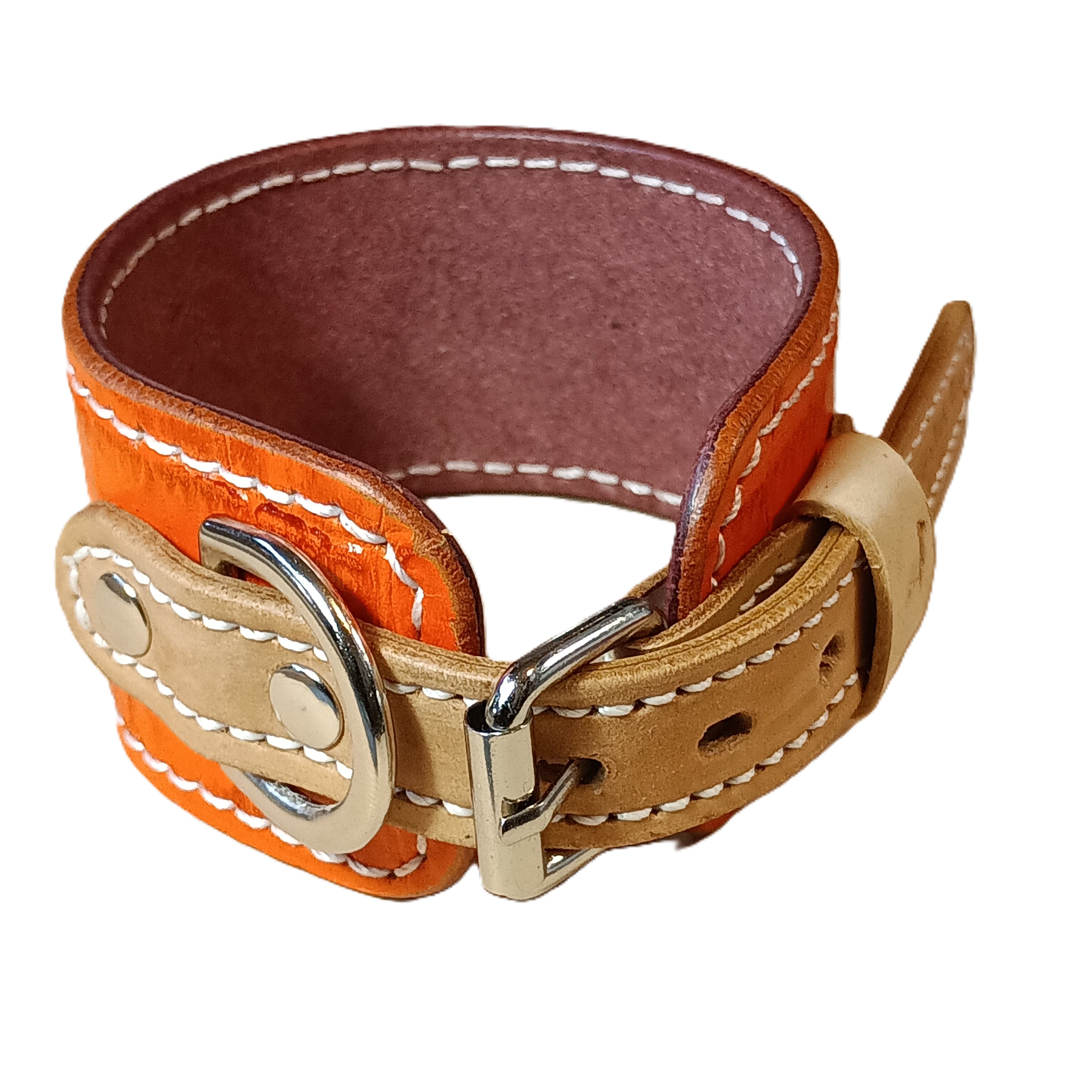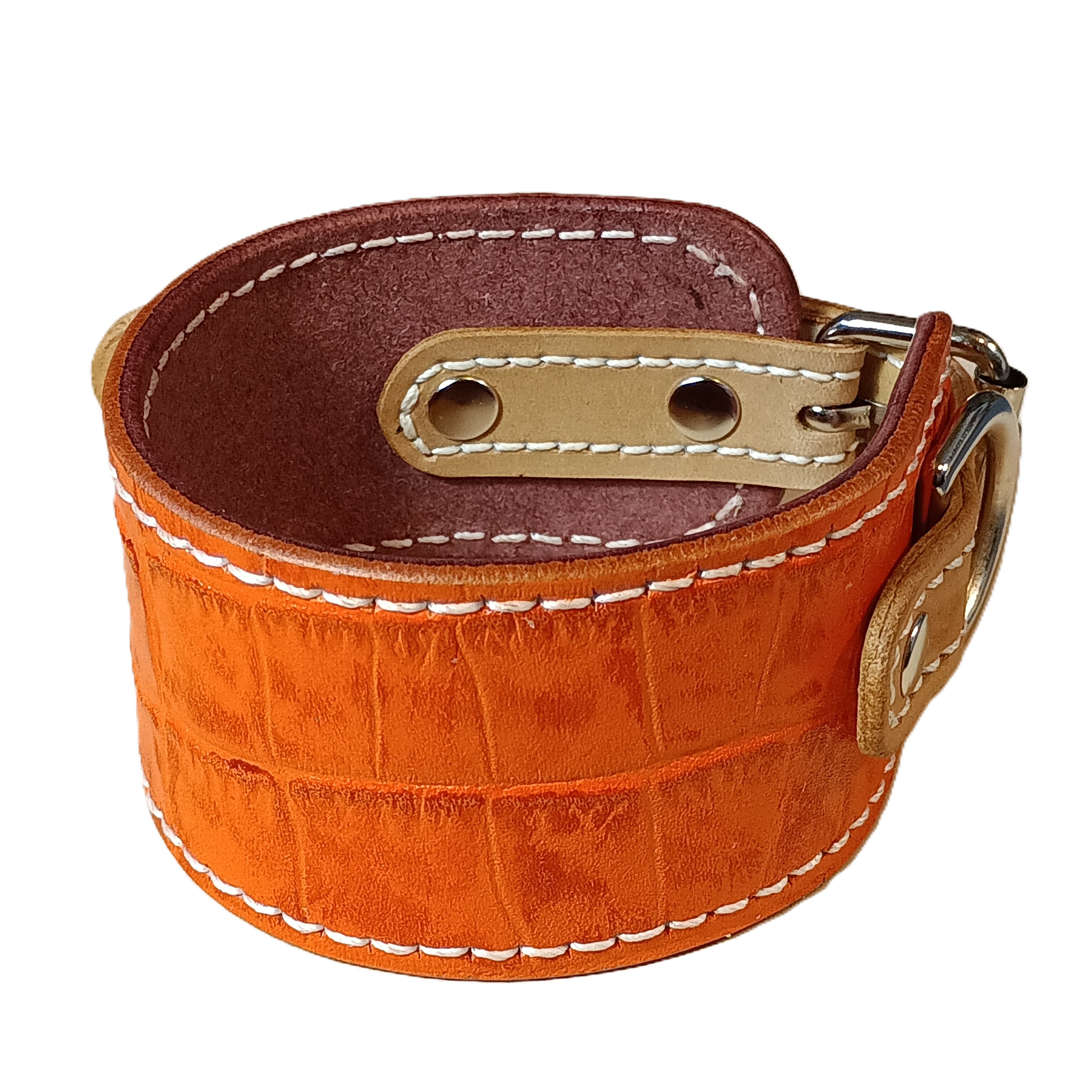 外側には個性的な型押しレザー、内側には肌当たりの良いナチュラルレザーを使用。