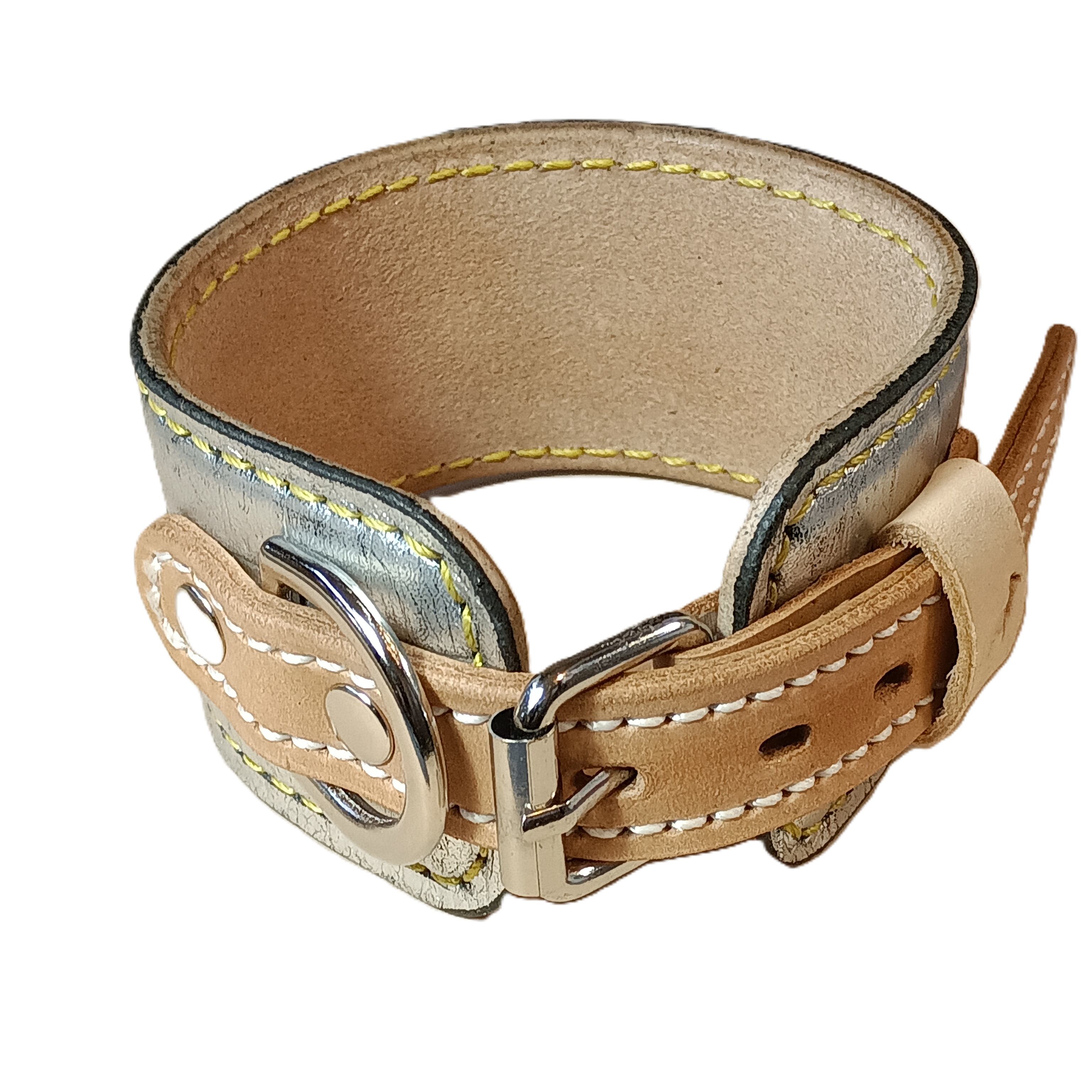 外側には個性的な型押しレザー、内側には肌当たりの良いナチュラルレザーを使用。