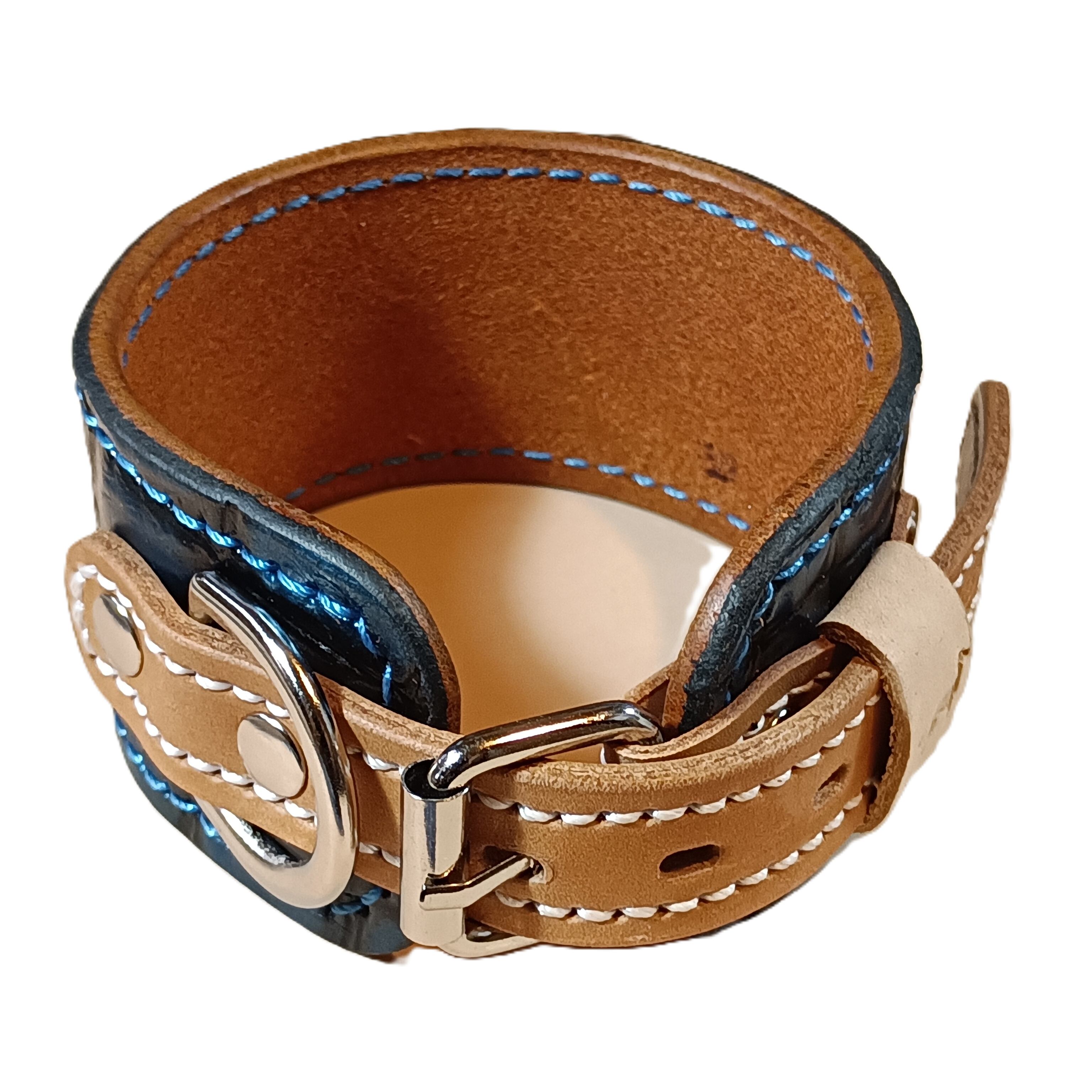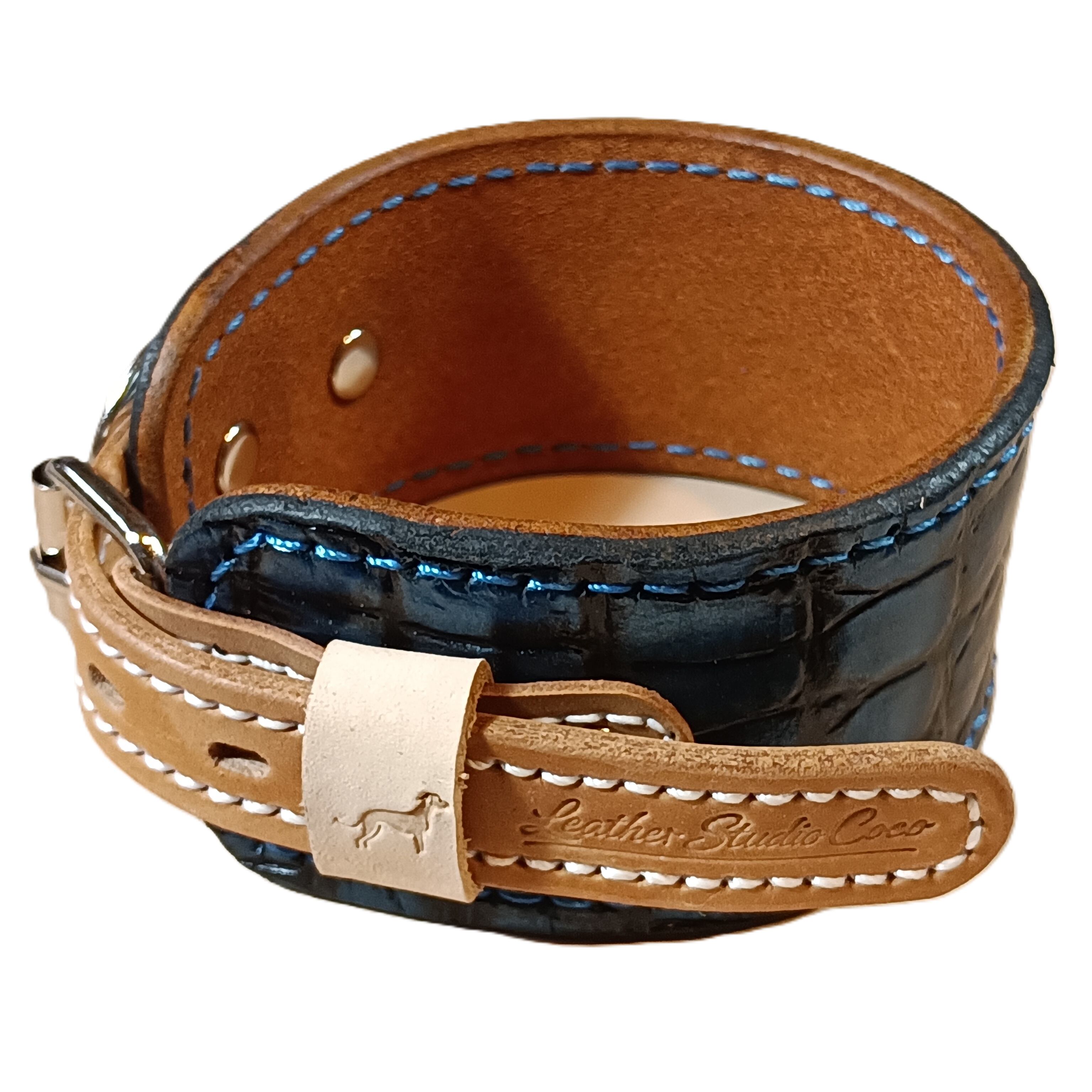 外側には個性的な型押しレザー、内側には肌当たりの良いナチュラルレザーを使用。