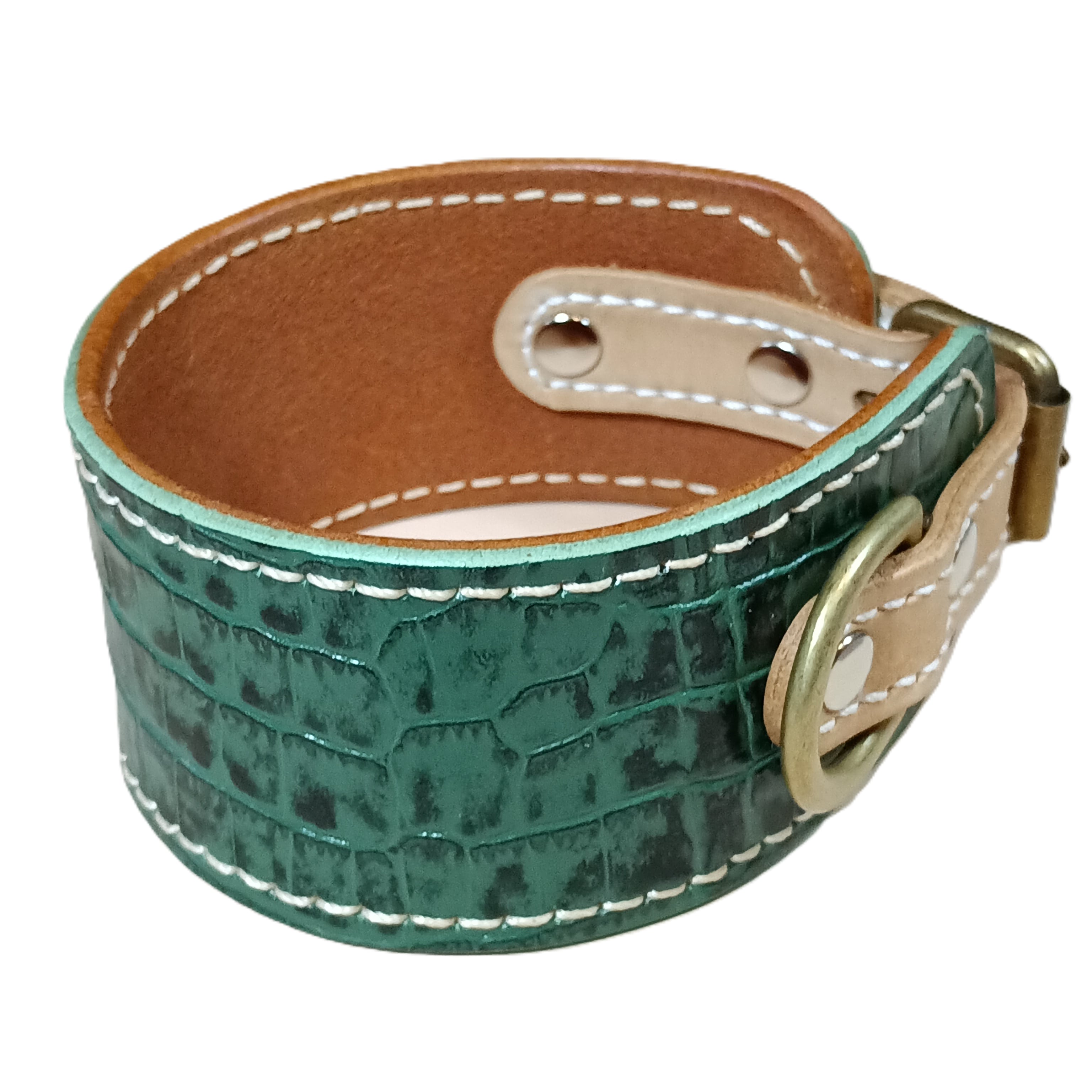 外側には個性的な型押しレザー、内側には肌当たりの良いナチュラルレザーを使用。