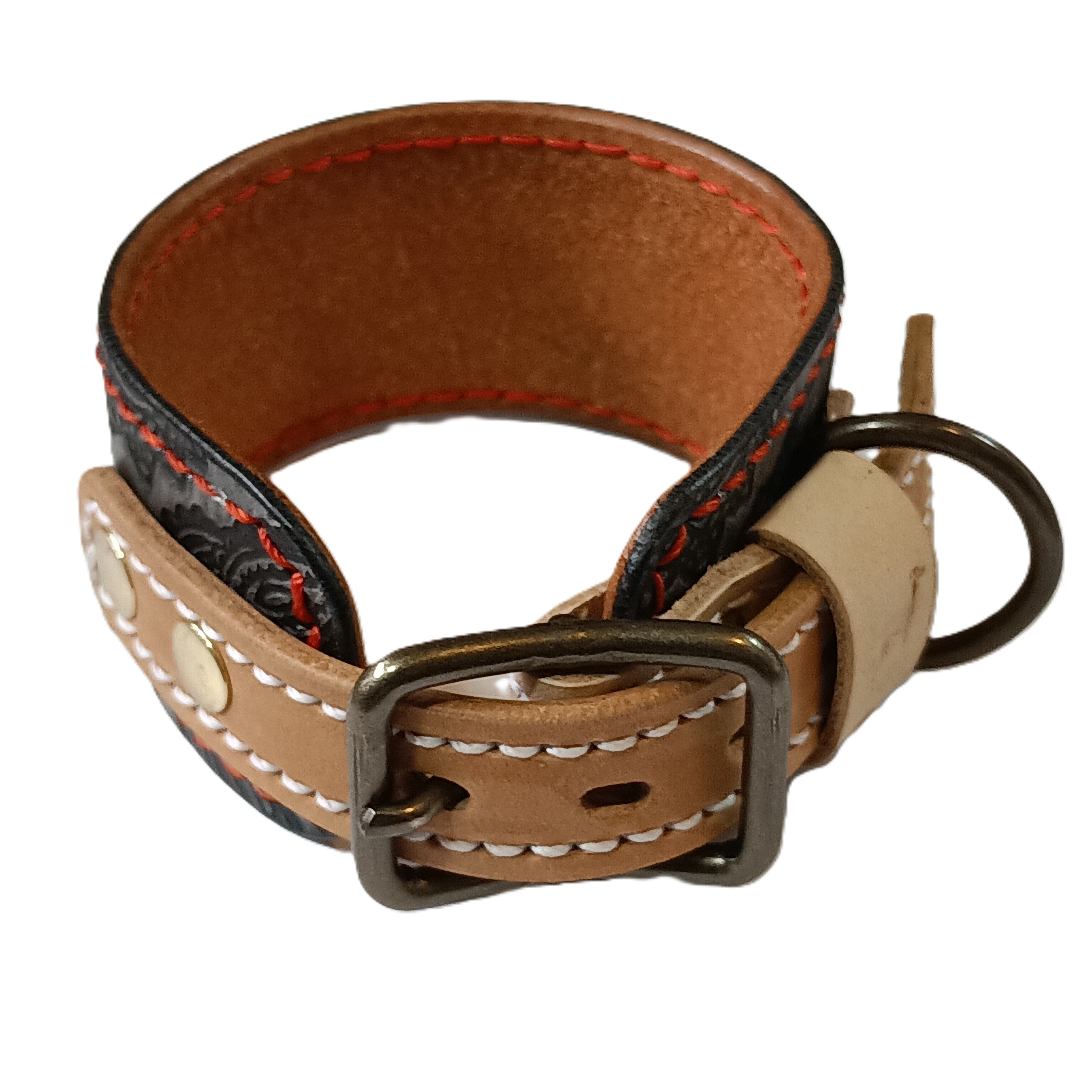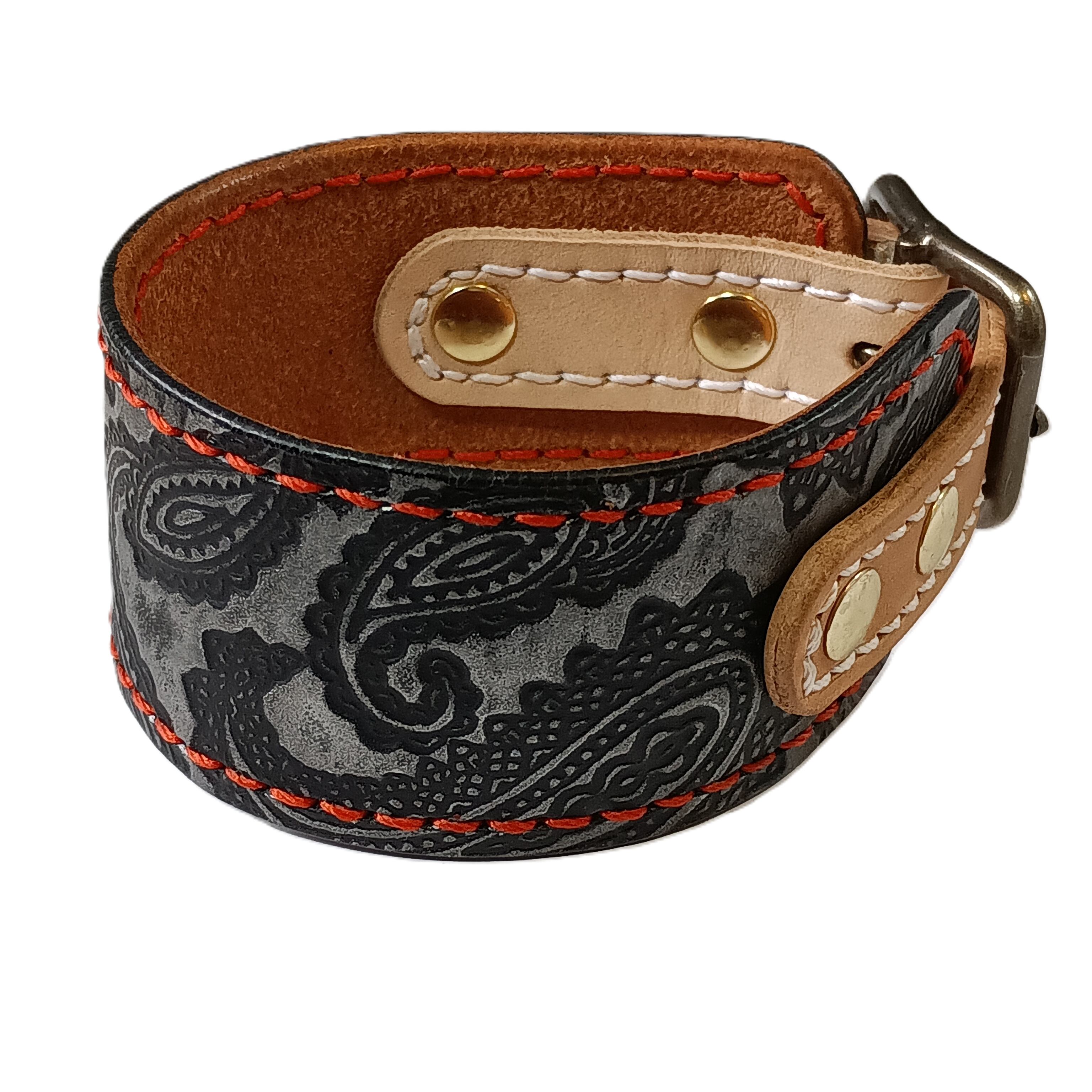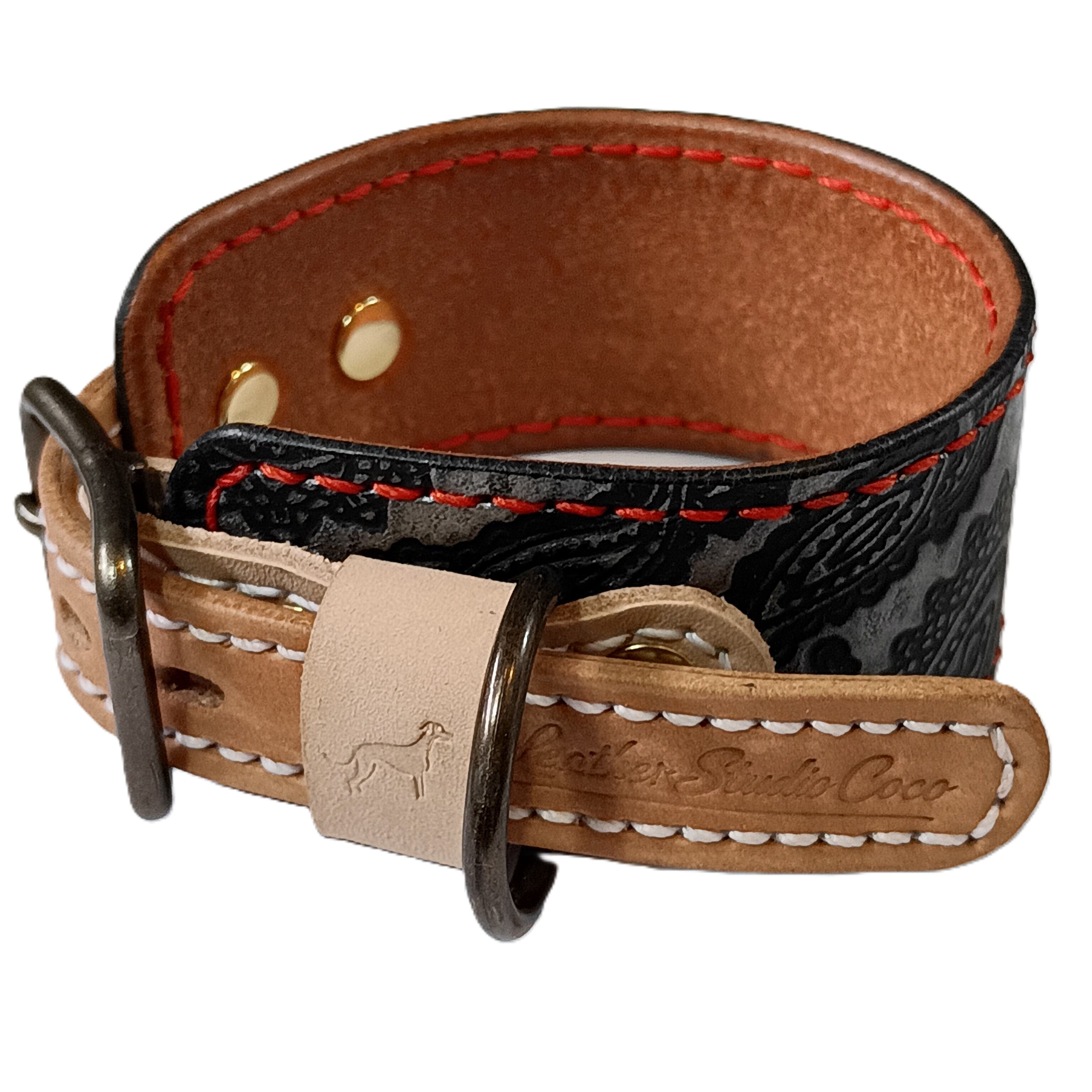 外側には個性的な型押しレザー、内側には肌当たりの良いナチュラルレザーを使用。